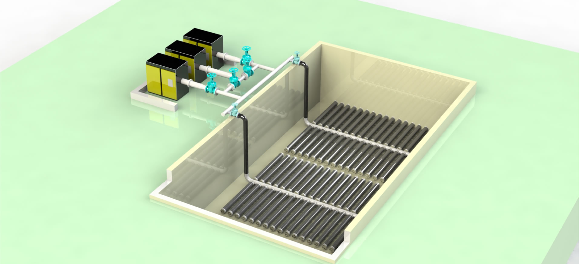 O ar necessário ao sistema é produzido por uma central de ar comprimido e distribuído ao longo do tanque por tubulações em aço inox, com diâmetros decrescentes, a fim de manter, aproximadamente, a mesma velocidade linear no fluxo de ar.